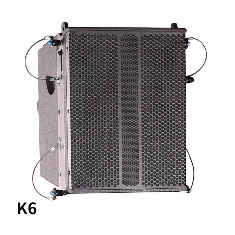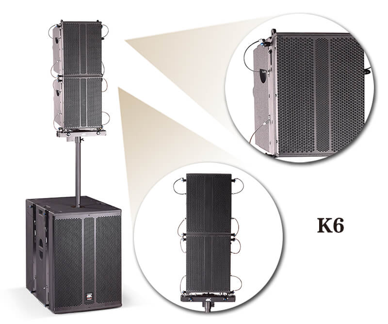K6K7配置两种吊挂方式,一种为三角型堆叠方式,可将K6堆叠起来,最多可支持4个。另一种则为四方田子架,同样可以做新产品堆叠作用,亦可将新产品进行吊挂,覆盖角度更低,具有80°×50°恒定水平方向性覆盖范围,为观众提供完美的聆听体验。垂直阵列设计逐渐成型以保证从第一行正确收听并避免典型的直阵列的高频波束。