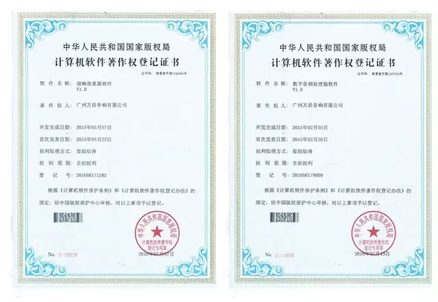除了产品研发取得科研成果外,万昌企业在计算机软件方面也取得突破性的发展,分别获得“混响效果器V1.0”和“数字音频处理器V1.0”著作权证书。这对组建音响系统有实质性作用,能让音响系统发挥更加出色的音质效果。